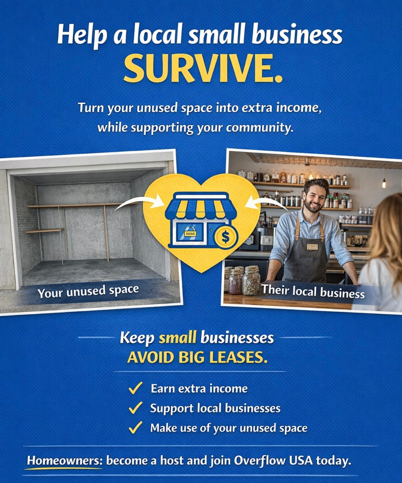 Overflow USA™ connects you with nearby homeowners offering secure, flexible storage space — so you can expand locally without SBA loans or long-term commitments.